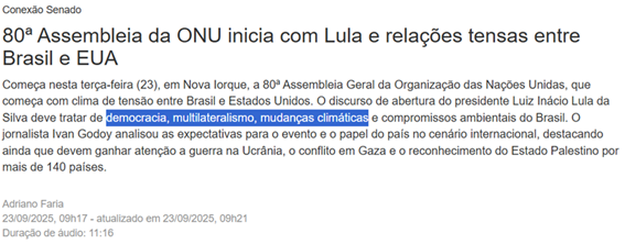 SE13916 - (Siga Escrevente. 2025. Inéditas) Começa nesta terça-feira (23), em Nova Iorque, a 80ª Assembleia Geral da Organização das Nações Unidas (ONU). O discurso de abertura, tradicionalmente proferido pelo Brasil, deve abordar temas centrais da política externa brasileira.