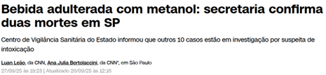 SE13910 - (Siga Escrevente. 2025. Inéditas) Pelo menos duas pessoas morreram no estado de São Paulo, o que levou a Secretaria de Saúde do Estado e a Secretaria de Segurança Pública a investigar diversos casos de intoxicação. O problema de saúde pública ocorreu após o consumo de bebidas adulteradas.