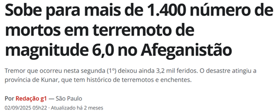 SE13917 - (Siga Escrevente. 2025. Inéditas) Um terremoto de magnitude 6,0, um dos piores dos últimos anos, atingiu uma área montanhosa e de construções precárias, deixando um grande número de mortos e feridos. O tremor ocorreu entre as províncias Kunar e Nangarhar.