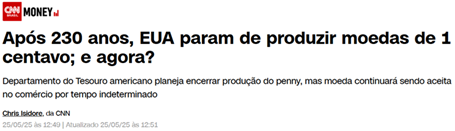 SE13321 - (Siga Escrevente. 2025. Inéditas) O Departamento do Tesouro de um país anunciou a intenção de descontinuar a produção de sua moeda de um centavo, que tem uma história de mais de 230 anos de cunhagem. Apesar da medida, essa moeda continuará a ser aceita no comércio por um período.