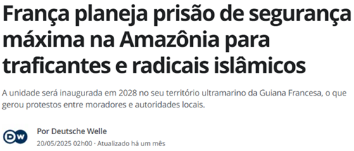 SE13315 - (Siga Escrevente. 2025. Inéditas) O governo francês planeja construir um anexo de segurança máxima em uma nova prisão na Guiana Francesa, o que tem gerado controvérsia. Essa unidade terá um propósito muito específico em relação aos tipos de detentos que irá abrigar.