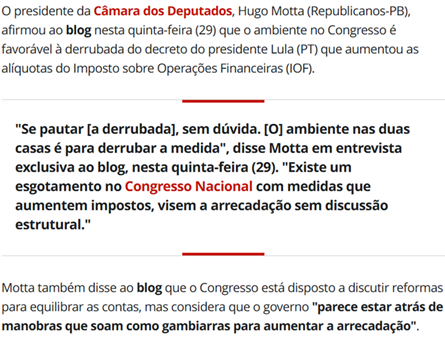 SE13317 - (Siga Escrevente. 2025. Inéditas) O presidente da Câmara dos Deputados, Hugo Motta, afirmou que o ambiente no Congresso Nacional é desfavorável a medidas que visam unicamente o aumento da arrecadação, como o recente aumento do Imposto sobre Operações Financeiras (IOF).