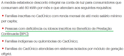 De acordo com o texto, qual é a condição específica exigida para que pessoas com deficiência ou idosos sejam beneficiados com o desconto integral na conta de luz?