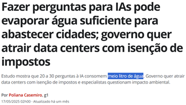 SE13320 - (Siga Escrevente. 2025. Inéditas) Uma pesquisa recente indicou que a utilização de plataformas de inteligência artificial tem um impacto significativo no consumo de recursos naturais. O processamento de dados por essas IAs, que ocorre em estruturas específicas, demanda grande quantidade de energia e água.