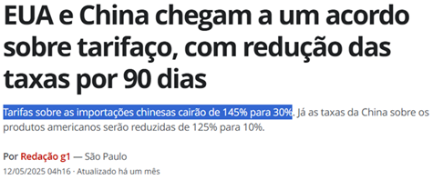 SE13323 - (Siga Escrevente. 2025. Inéditas) Estados Unidos e China concordaram em reduzir temporariamente as tarifas recíprocas entre os dois países por um período de 90 dias. Esse acordo foi anunciado em Genebra, na Suíça, após um encontro entre representantes das duas potências.