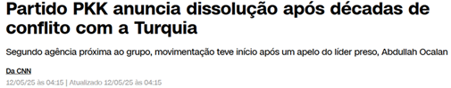SE13314 - (Siga Escrevente. 2025. Inéditas) O grupo militante _______________ anunciou na segunda-feira (12) que decidiu se dissolver, segundo a mídia próxima ao grupo separatista, em um movimento histórico após décadas de conflito com a Turquia, que matou dezenas de milhares de pessoas.