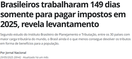 SE13322 - (Siga Escrevente. 2025. Inéditas) De acordo com o Instituto Brasileiro de Planejamento e Tributação (IBPT), os brasileiros trabalharam 149 dias, do início do ano até 29 de maio, exclusivamente para pagar impostos, que correspondem a cerca de 40,82% da renda média anual. Apesar da alta carga tributária, o estudo do IBPT aponta para uma falha significativa na forma como esses tributos são devolvidos à população.