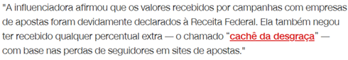 Qual termo específico Virginia Fonseca negou ter recebido em seu depoimento na CPI das Bets, relacionado a um percentual extra baseado nas perdas de seguidores em sites de apostas?