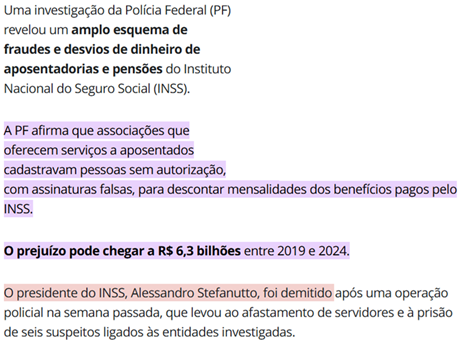 SE13296 - (Siga Escrevente. 2025. Inéditas) Uma investigação da Polícia Federal (PF) revelou um amplo esquema de fraudes e desvios de dinheiro do Instituto Nacional do Seguro Social (INSS), resultando na demissão de um alto funcionário e na prisão de suspeitos.