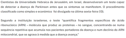 SE13294 - (Siga Escrevente. 2025. Inéditas) Cientistas desenvolveram um teste capaz de detectar a doença de Parkinson antes que os sintomas se manifestem. O procedimento classificado como simples e econômico foi divulgado na última sexta-feira (13).