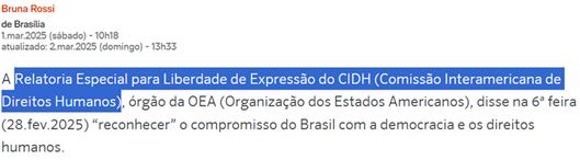 SE13187 - (Siga Escrevente. 2025. Inéditas) Um importante órgão da Organização dos Estados Americanos (OEA) emitiu uma nota na sexta-feira (28.fev.2025) na qual reconhece o compromisso do Brasil com a democracia e os direitos humanos. As opiniões sobre o estado da liberdade de expressão no país, no entanto, são divergentes, e um relatório final sobre o tema ainda não foi produzido.