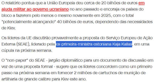 SE13186 - (Siga Escrevente. 2025. Inéditas) Um documento de discussão do serviço diplomático da União Europeia sugere um aumento significativo na ajuda militar à Ucrânia para este ano. A proposta visa dobrar o valor já concedido e estabelece que os países membros devem contribuir com base em seu peso econômico. Essa discussão ocorre em um contexto de incerteza sobre o apoio de outras nações e busca garantir a continuidade do auxílio a Kiev.