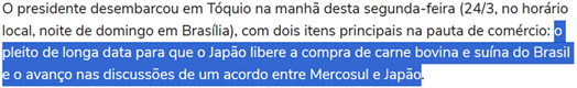 O presidente desembarcou em Tóquio na manhã desta segunda-feira (24/3, no horário local, noite de domingo em Brasília), com dois itens principais na pauta de comércio: