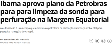 SE13173 - (Siga Escrevente. 2025. Inéditas) Um plano de limpeza de sonda para perfuração na Foz do Amazonas foi aprovado por um órgão ambiental, o que representa um avanço para a Petrobras na obtenção de uma licença ambiental para pesquisa na região do Amapá. A medida foi divulgada por veículos de imprensa e é considerada uma etapa de rotina, mas não é decisiva para a concessão da licença final.