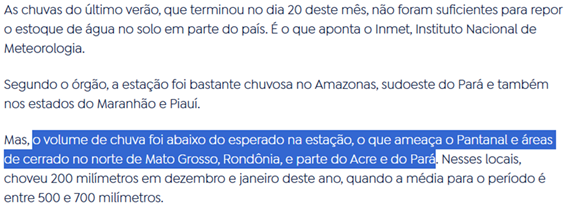 SE13170 - (Siga Escrevente. 2025. Inéditas) As chuvas do último verão, que se encerrou em 20 de março, não conseguiram repor o estoque de água no solo em algumas regiões do Brasil, conforme o Instituto Nacional de Meteorologia (Inmet).