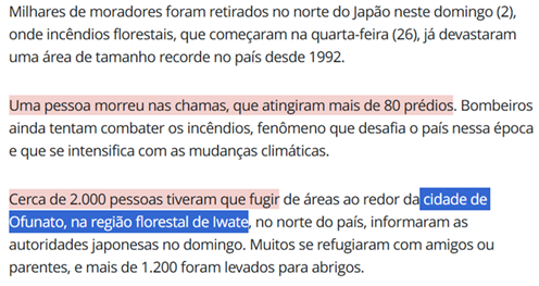 SE13172 - (Siga Escrevente. 2025. Inéditas) Incêndios florestais no norte do Japão, iniciados na última quarta-feira (26), provocaram a retirada de milhares de moradores e já causaram a devastação de uma área recorde para o país desde 1992. Uma pessoa morreu, e mais de 80 prédios foram atingidos pelas chamas, que ainda estão sendo combatidas por bombeiros. O fenômeno é um desafio para o Japão e tem sido intensificado pelas mudanças climáticas.