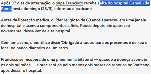 SE13165 - (Siga Escrevente. 2025. Inéditas) Após 37 dias de internação, o Papa Francisco recebeu alta hospitalar neste domingo (23/3). Antes de sua liberação, o líder religioso acenou para fiéis de uma janela do hospital. Recuperando-se de pneumonia bilateral, o pontífice precisará de dois meses de repouso no Vaticano.