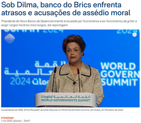 SE13168 - (Siga Escrevente. 2025. Inéditas) A atual presidente do Novo Banco de Desenvolvimento (NDB), ou banco dos Brics, tem enfrentado críticas internas e acusações. Relatos indicam que a instituição está com atrasos significativos em suas metas de concessão de crédito e operações não soberanas para o período de 2022 a 2026. A falta de publicação dos relatórios anuais de 2023 e 2024 também foi notada.