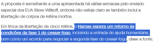 SE13166 - (Siga Escrevente. 2025. Inéditas) O Hamas aceitou uma nova proposta para a libertação de reféns, negociada com o Egito. Essa proposta, que se assemelha a uma anterior apresentada pelos EUA, busca o retorno de certas condições em troca da libertação de cinco indivíduos, incluindo um cidadão americano-israelense.
