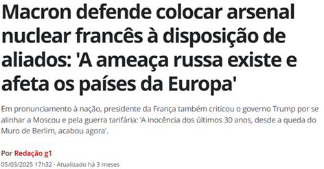 SE13169 - (Siga Escrevente. 2025. Inéditas) Em um pronunciamento nacional, o líder de um país europeu classificou uma nação vizinha como uma ameaça ao continente, defendendo a união em prol da Ucrânia. Ele mencionou a possibilidade de discutir a disponibilização do arsenal nuclear de seu país para aliados como forma de dissuasão. O pronunciamento também incluiu críticas a uma administração americana anterior por seu alinhamento com Moscou e suas políticas tarifárias.