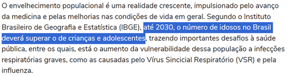 SE13167 - (Siga Escrevente. 2025. Inéditas) envelhecimento populacional no Brasil é uma realidade crescente, trazendo importantes desafios à saúde pública. Dados do Instituto Brasileiro de Geografia e Estatística (IBGE) projetam uma mudança demográfica significativa. A vulnerabilidade dessa população a infecções respiratórias graves, como as causadas pelo Vírus Sincicial Respiratório (VSR) e pela influenza, é uma preocupação, especialmente para pessoas com mais de 60 anos e com comorbidades. O Boletim Epidemiológico InfoGripe da Fiocruz, até 22 de maio, registrou um alto número de hospitalizações por Síndrome Respiratória Aguda Grave (SRAG), com uma parcela considerável atribuída ao VSR.