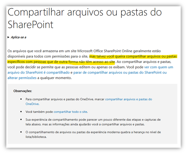 Os arquivos armazenados em um site Microsoft Office SharePoint Online só ficam disponíveis para quem tem permissão para o site, não sendo possível compartilhar arquivos ou pastas com pessoas que não possuem acesso ao site.