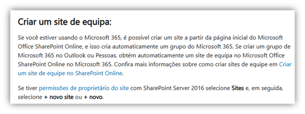 Se você estiver usando o Microsoft 365, é possível criar um site a partir da página inicial do Microsoft Office SharePoint Online, e isso cria automaticamente um grupo do Microsoft 365.