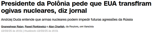 Qual é o país do presidente Andrzej Duda que fez a solicitação aos Estados Unidos para a transferência de armas nucleares?