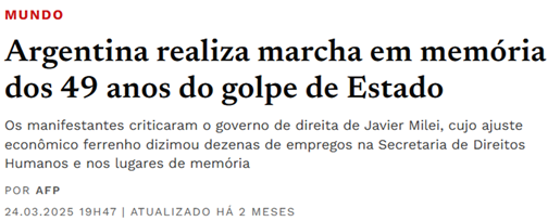 SE13148 - (Siga Escrevente. 2025. Inéditas) Em 24 de março, dezenas de milhares de pessoas marcharam em Buenos Aires, unindo-se às Avós e Mães da Praça de Maio sob o lema "Memória, verdade e justiça". O ato relembrou um período sombrio na história argentina.
