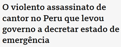 SE13145 - (Siga Escrevente. 2025. Inéditas) Paul Flores, cantor de uma banda de cúmbia popular na América Latina, foi assassinado na capital do país, na madrugada de domingo (16/03), após um show. Um grupo não identificado atirou contra o ônibus da banda Armonía 10, e dois disparos foram fatais para o cantor. A banda havia denunciado ameaças e tentativas de extorsão, nas quais eram exigidas altas quantias em troca de proteção. Um ataque semelhante havia ocorrido em dezembro, sem vítimas.